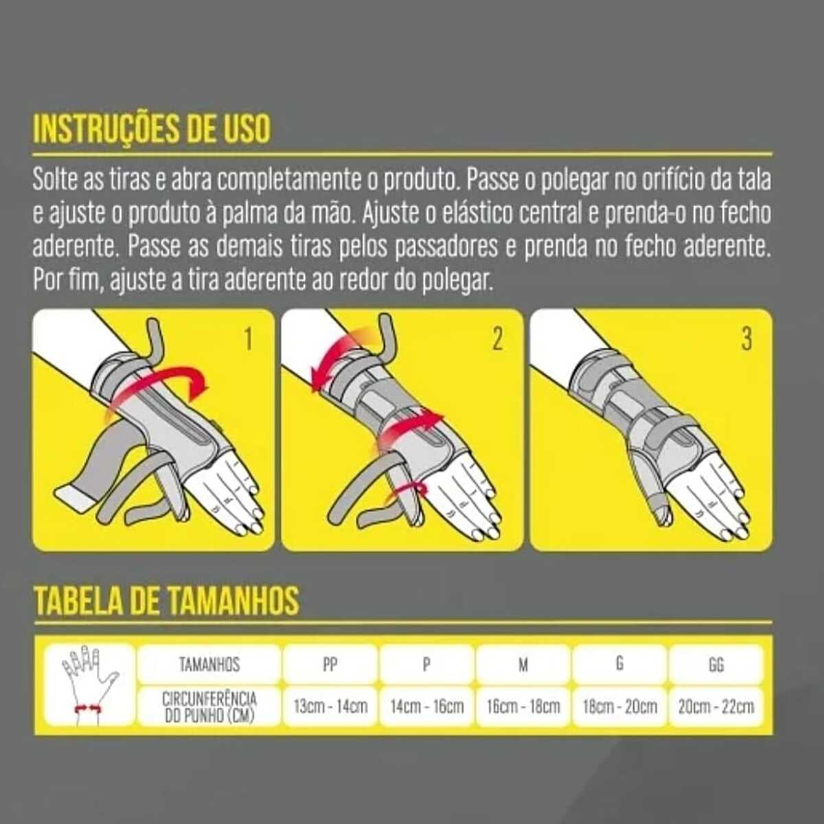 O produto oferece 3 talas que oferecem imobilização para o punho e polegar. O elástico proporciona compressão que é ajustável conforme a necessidade e as tiras oferecem maior firmeza e segurança articular. Auxilia em tratamentos que exijam estabilização do punho e do polegar. Alivia a dor e matem o posicionamento anatômico na prevenção e tratamento de doenças inflamatórias que afetam a região do punho e polegar.