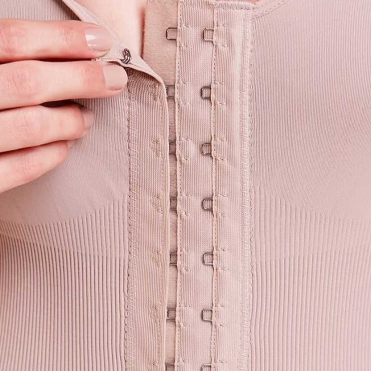 - Compressão moderada na altura das mamas, oferecendo suporte suave.