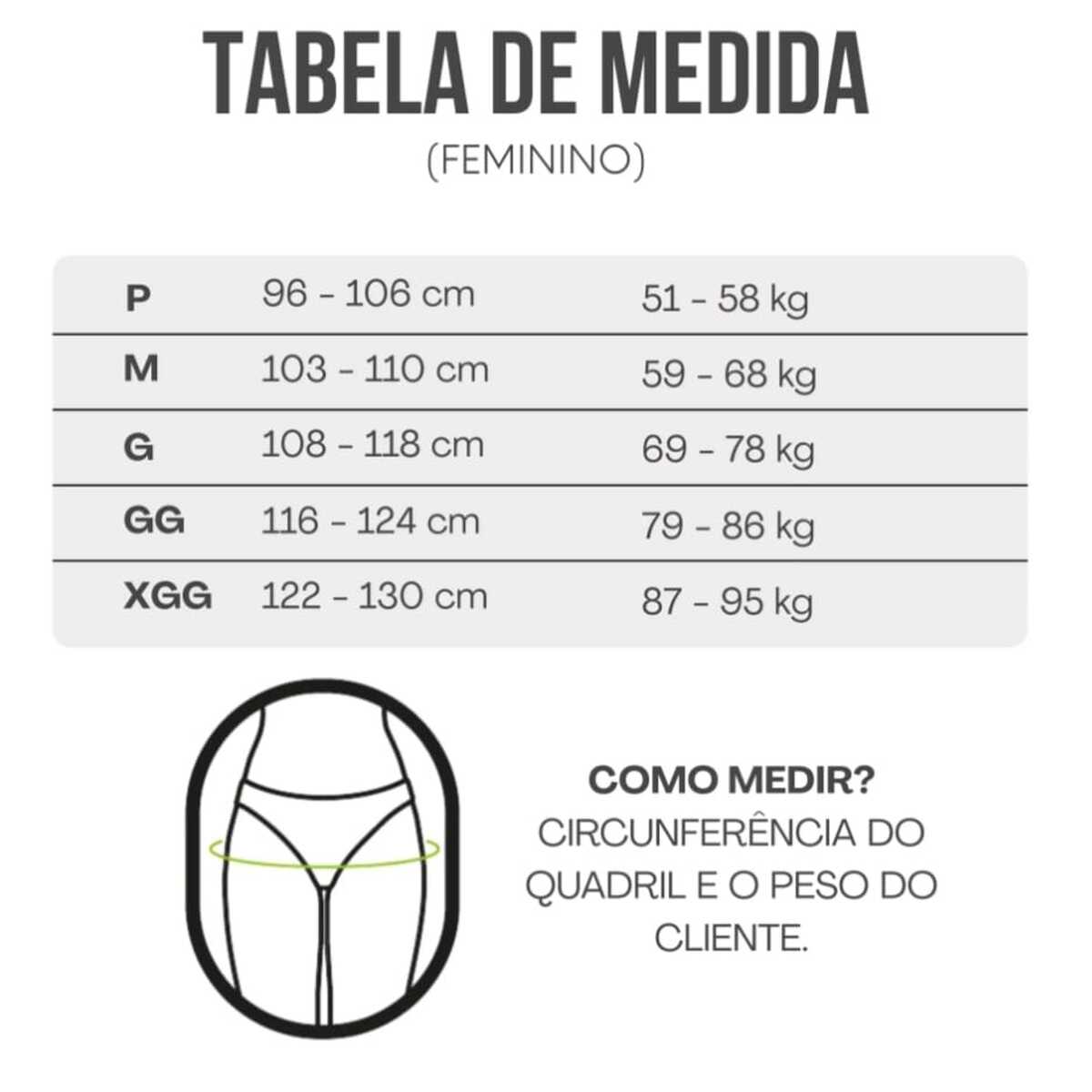 Cinta abdominal com fechamento lateral e alça destacável, alta compressão, com reforço duplo do tecido na frente e nas costas.