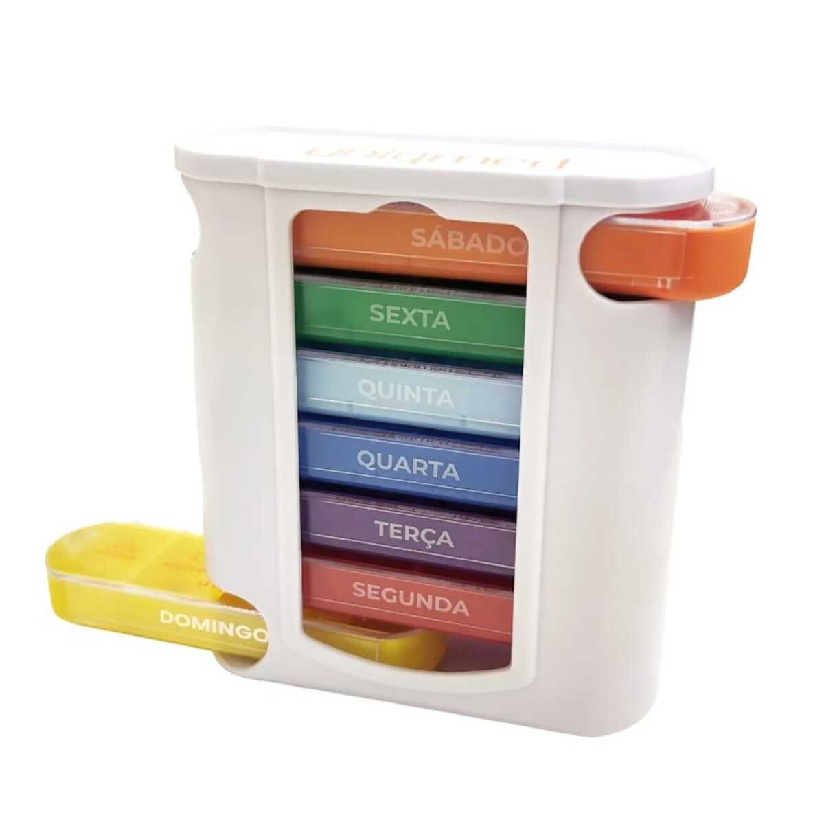 Possui 7 compartimentos indicados com os dias da semana e divisórias por períodos de utilização (Manhã/Meio-Dia/Tarde/Noite) para melhor organização das suas medicações.